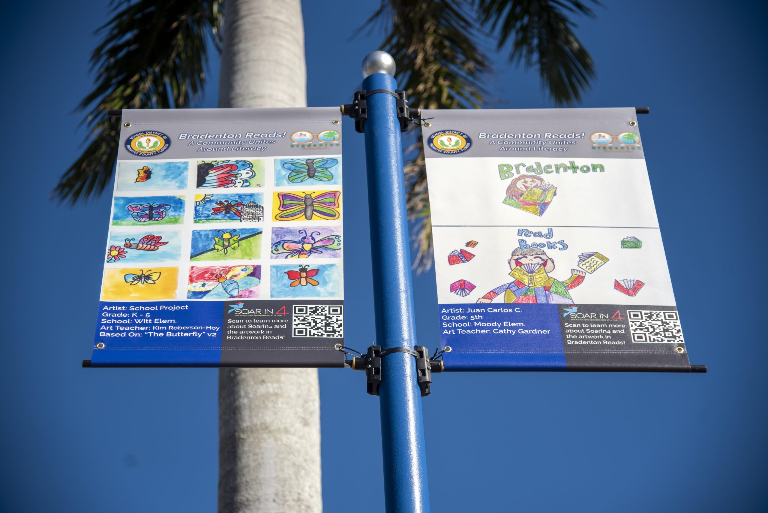 235 street pole banners showcasing beautiful SDMC student artwork are now hung along Main Street, the Riverwalk, and Village of the Arts. In addition to the student artwork, the banners also feature literacy tips and a QR code that links to the Soar In 4 website, where parents can learn more about being their child’s first literacy teacher.