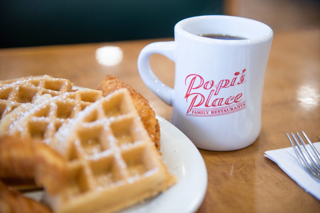 The menu is extensive, starting with three pages of breakfast options, served until 3:00 pm daily, offering everything from Omelets, French toast, and breakfast sandwiches to Popi’s Famous Chicken Biscuit Breakfast.