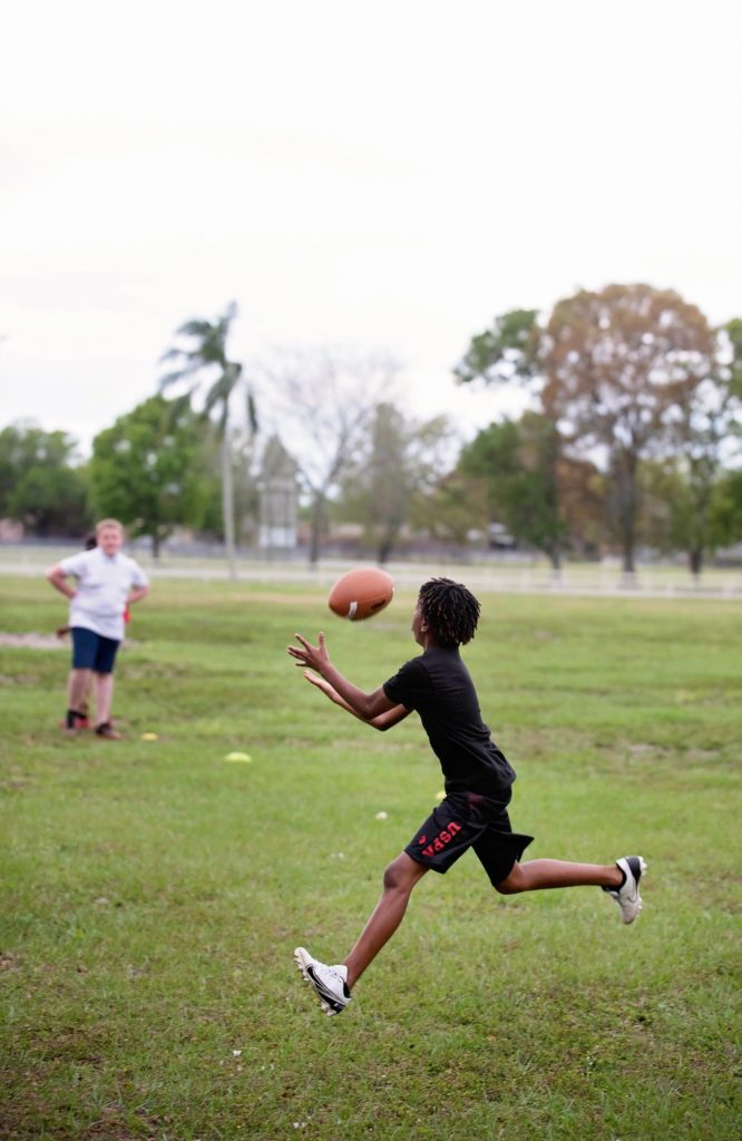 When the kids catch sight of him ready to train each day, they burst out onto the sandy and grassy stretch, often too anxious to wait for the official cue to run a warm-up lap. One takes off – face in the wind and shoes kicking up a cloud of dust. The others follow. When they catch a glimpse of Sanders bringing out a football, they dive right into a game.