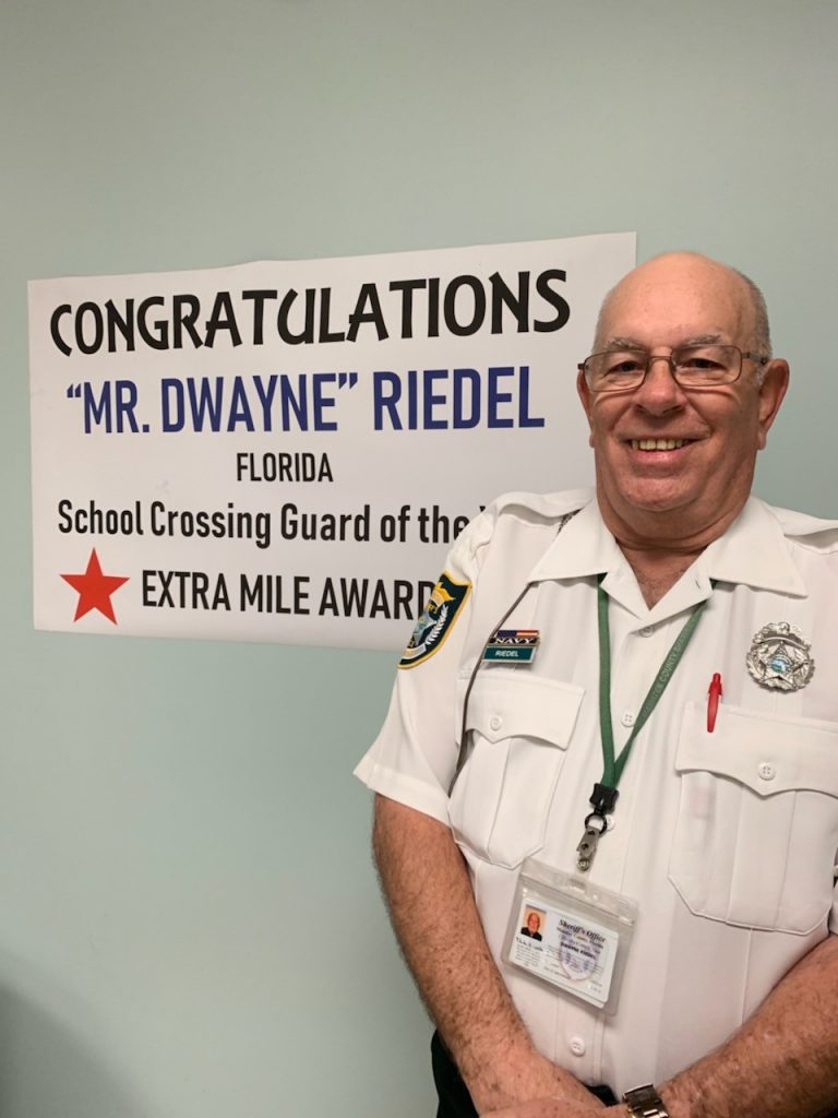 Riedel might not see himself as an extraordinary crossing guard, but his community sure does. With more than 300 agencies and upwards of 15,000 school crossing guards in the state of Florida, this year Riedel beat out hundreds of entries in the Florida Crossing Guard of the Year award and was one of only three recipients to achieve this prestigious status. In addition, the state honored Riedel with The Extra Mile Award, an accolade given to only one crossing guard annually.