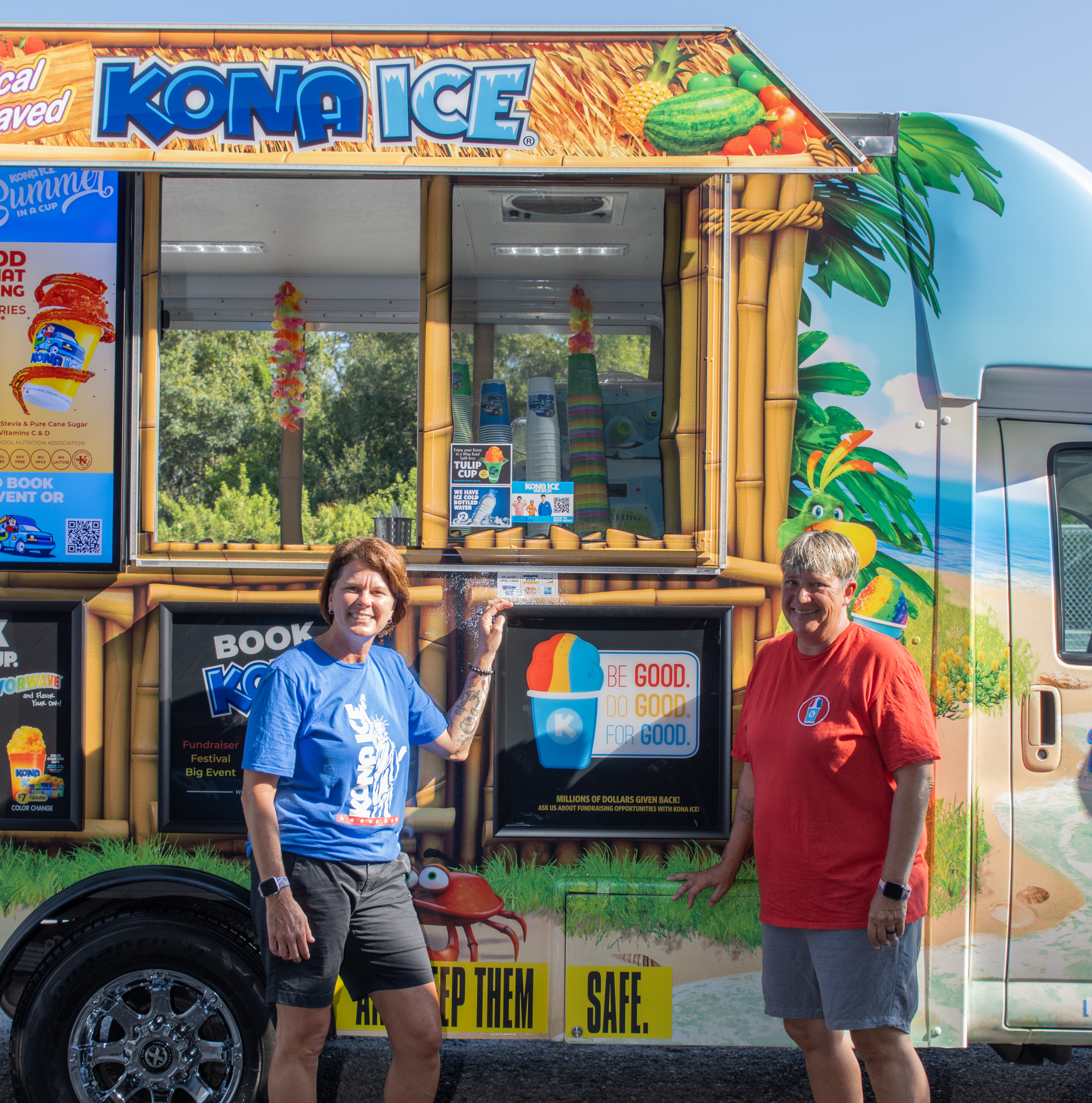 She came across Kona Ice one night doing a food truck event in 2015. The founder of Kona Ice, Tony Lamb, created his business model around giving back to the community. Stephanie immediately got goosebumps on her arms and butterflies in her stomach. She couldn’t wait to tell her wife, Chris, what she had found.