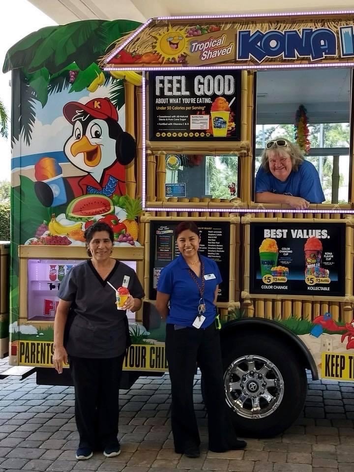 At that point, Chris and Stephanie’s territory was Ellenton to the Island and down into Bradenton. Betsy partnered with them, and they bought a third Kona Ice truck.