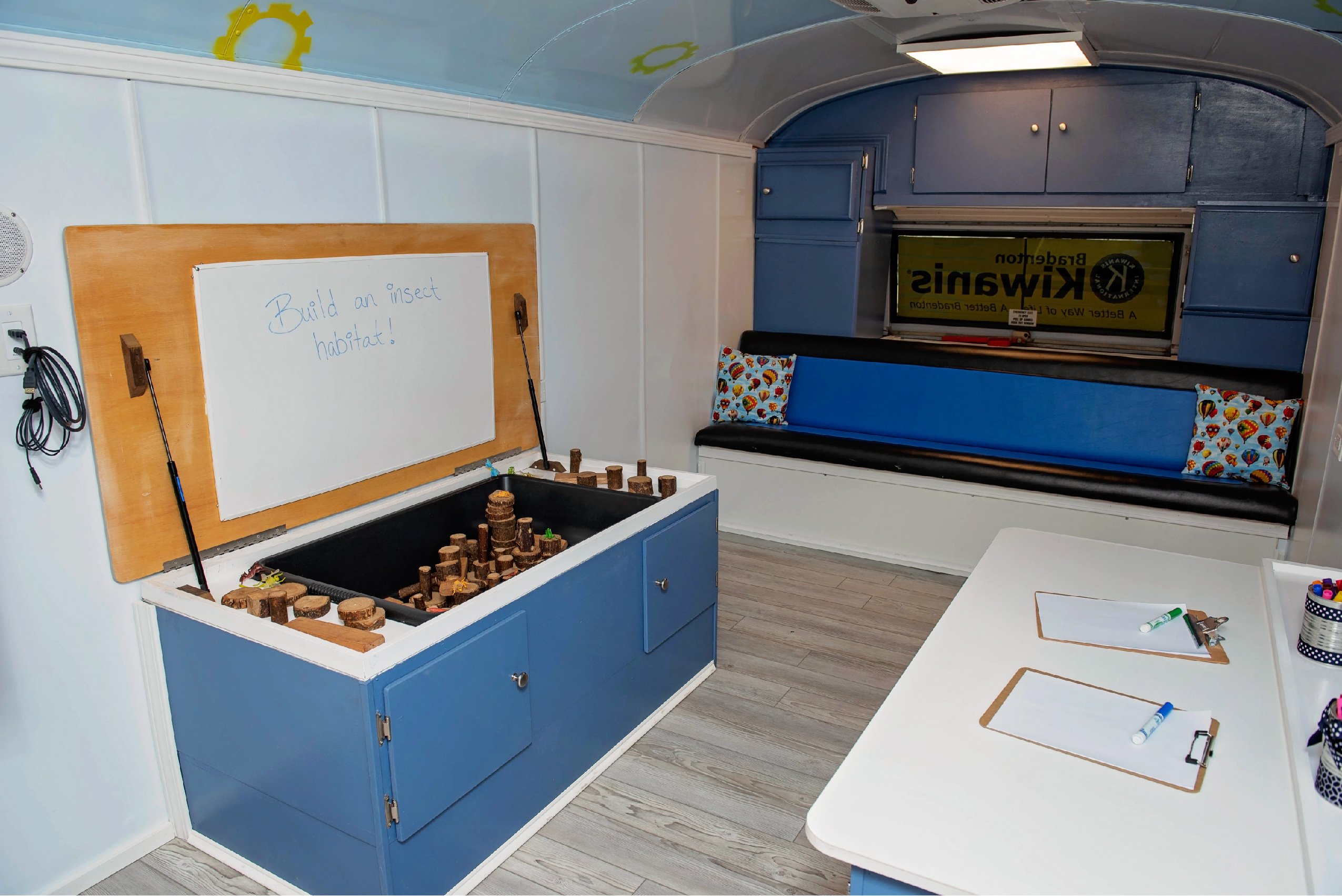 The exterior design was created with a vision to make the bus stand out and be a community symbol of creative thinking, educational empowerment, and collective community engagement. The bus is now furnished with air conditioning, full power, modern technology, traditional classroom tools, and bright yet calming colors – it is engaging from the moment children step aboard. The walls were custom fabricated to be both magnetic and dry erase! Teachers and students alike can capture their thinking through sketching on the walls.