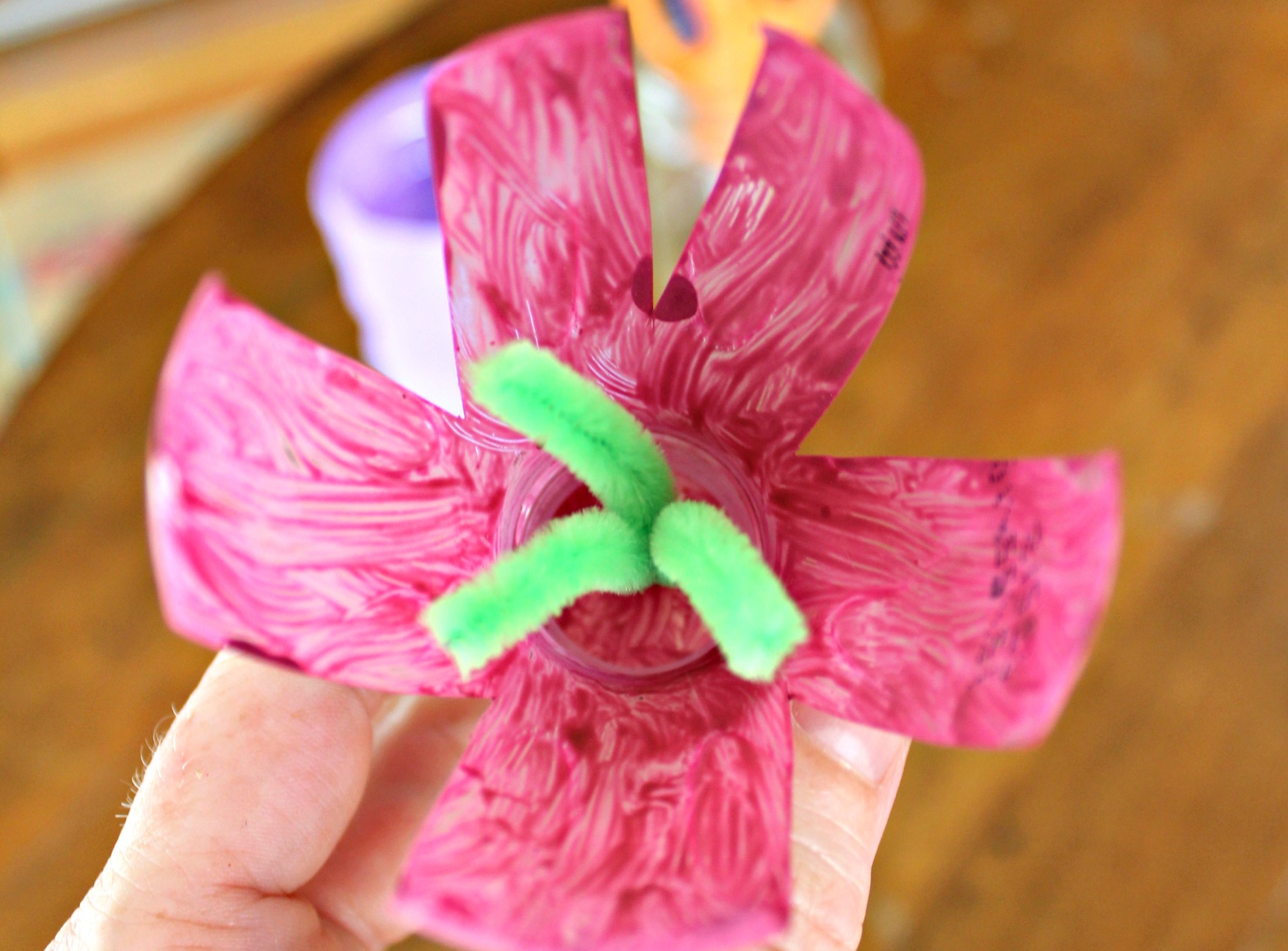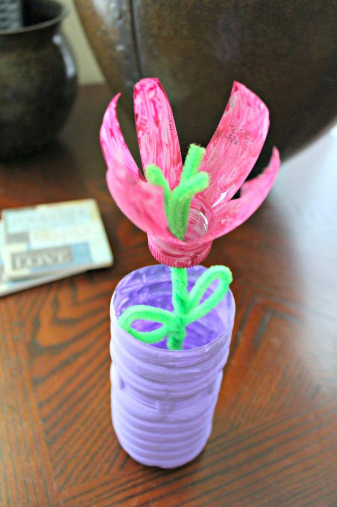 My daughter’s finished flower is so unique, and since the vase is made from a water bottle, live flowers could also be added to the display. This gift is durable as well as a great way to repurpose and reuse. I hope this craft inspires a creative activity with your family as well for this Mother’s Day!